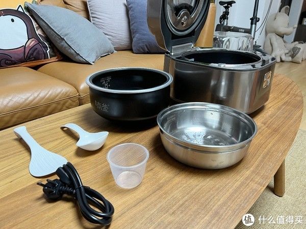 除了机器本身,还有加厚加深的蒸笼、饭勺以及量杯。
